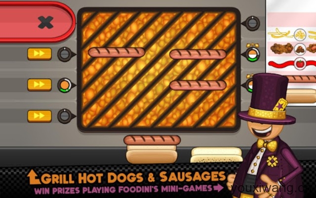 1、记录好客人的需求后,就可以来到第一步煎烤肠,这一步的关键就是翻面时机,待一半的颜色变成橙色后就点击翻面,待另一面变成同样的颜色后就可以拿出来了。