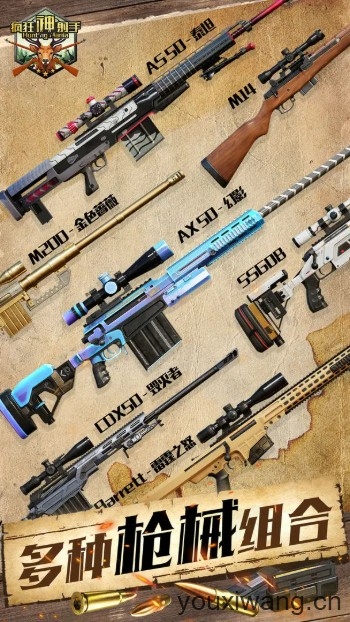 2、超多枪械组合可以任你挑选,强力的狙击枪搭配上稀有子弹,帮助你进阶顶尖狙击手,狩猎更多猎物。
