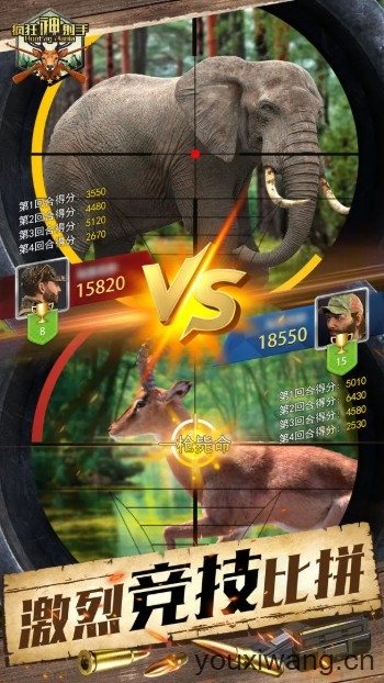 踏入狂野的狩猎场,成为最强的顶尖猎手!疯狂神射手是一款非常真实刺激的狩猎竞技手游。这里有着无比逼真的生态狩猎场,让你可以追寻各种珍惜动物的足迹,体验刺激精彩的狩猎乐趣!还可以去收集各种枪械、子弹,自由搭配你的枪械组合,帮助你进阶成为顶尖狙击手!除此之外,游戏内还有着残酷刺激的PVP竞技场,与其他玩家展开酣畅淋漓的狩猎对决!