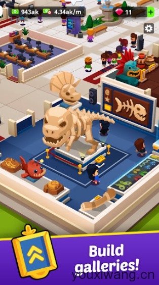 挂机博物馆大亨,英文全名为Idle Museum Tycoon:Art Empire,是一款卡通风格的模拟经营手游。在游戏中,我们将会成为博物馆的馆长,立志将它发展成为全球最知名的博物馆。为此,我们需要四处探险来寻找各种古董化石,或者去解锁各种珍稀宝物来提高博物馆的吸引力,通过售卖门票来赚取更多的利润,一步步的扩展博物馆的规模!我们将在游戏中简单各种风格的展览馆,如中美洲、侏罗纪、文艺复兴、当代艺术等等,过程也是相当的有意思!