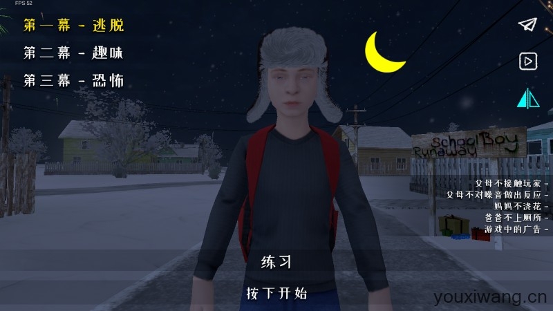 逃跑男孩中文版,3D第一人称视角的逃生游戏,并且是汉化后的全新版本,让你拥有更流畅的解谜旅程!游戏中你是一名不爱学习的学生,因此被父母经常惩罚,所以你觉得逃出家门。你需要非常小心的去寻找物品来设计你的逃生计划,随时注意父母,他们会注意到打开的柜子和门,一旦被发现,后果不堪设想!