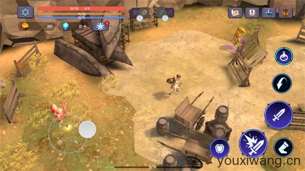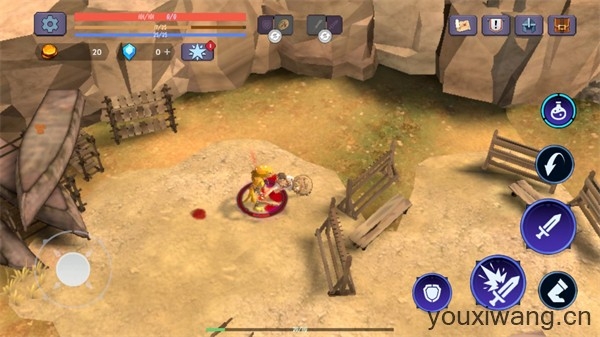 2、正式开始后左边控制角色的移动,右边是攻击、格挡、翻滚按钮。