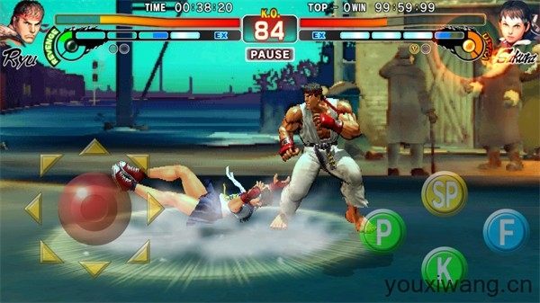 4、正式开始后左边控制角色的移动,右边的P是轻击、K是踢击、F是重击,SP是特殊技能。