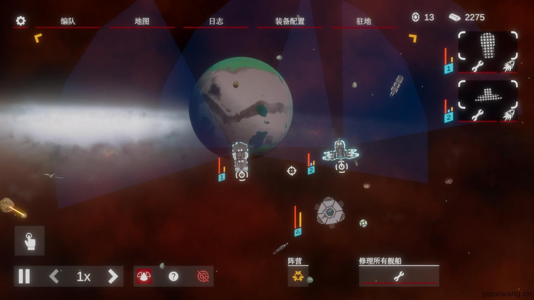 4、进入新区域遇到敌人后舰船会自动进行攻击,击败敌人后点击扳手按钮可以维修舰船。