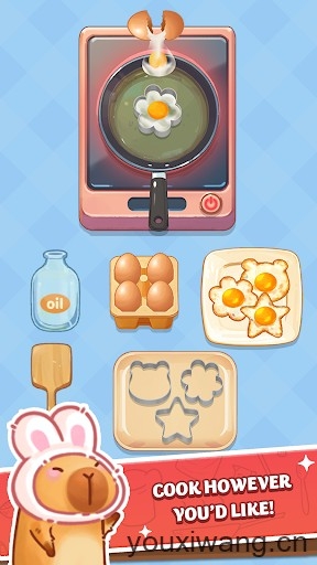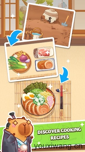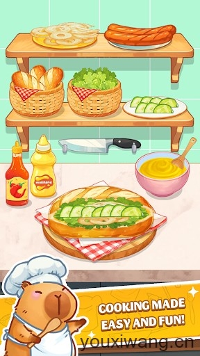 放松身心,烹饪美味佳肴,将您舒适的厨房变成梦幻般的水豚餐厅!丰富种类的美食都可以在你手中完成,尽情的去享受烹饪美食的乐趣吧!