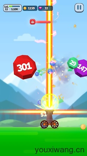 1、玩法非常的简单,只需左右移动大炮去射击即可,将打砖块与射击玩法的完美结合,既是经典又很创新。
