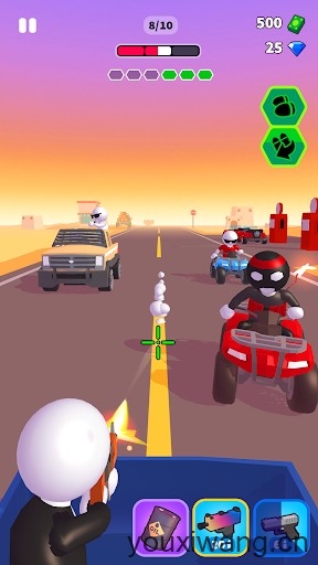 公路神枪手,英文全名叫做Rage Road-Car Shooting Game,也可以译作街口枪战,是一款休闲有趣的射击闯关类手游。在游戏中,我们将会成为一名高级特工,完成任务撤退的途中,遭到了来自敌人的追杀,我们需要在自己的车上隐蔽起来,然后通过射击来阻止敌人追上我们,通常是打爆汽车的轮胎,必要的时候也需要对敌人进行击杀!通过完成任务来解锁更多的武器、汽车和皮肤,享受精彩的闯关乐趣。