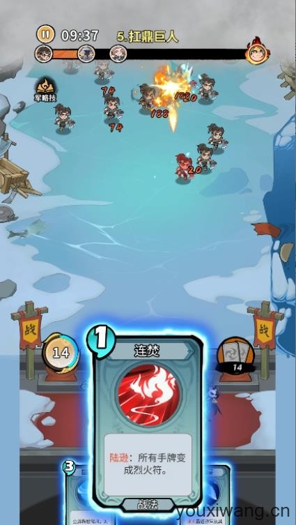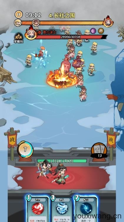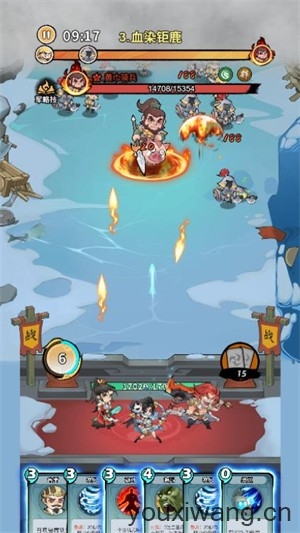 3、召唤武将后会自动攻击出现的敌人,每次使用卡牌都会消耗能量,能量不足则无法使用卡牌。