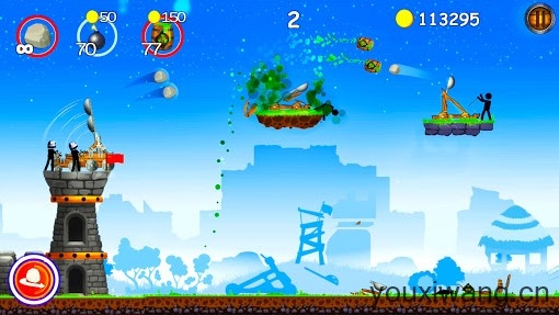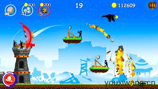 火柴人之守卫城堡(The Catapult),一款火柴人主题的塔防射击类手游。在游戏中,玩家们需要帮助自己的火柴人士兵保卫自己的城堡,通过攻城投石车来投掷石块、炮弹、炸药等武器,消灭敌人并摧毁他们的攻城塔,不断的获得更高的分数,赚取更多的金币!除此之外,游戏内还设计了趣味十足的双人模式,玩家可以邀请自己的小伙伴对战,看看谁的火柴人更厉害!