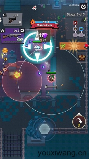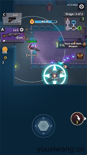 4、正式开始后滑动屏幕可以控制角色的移动,当角色移动时会使用副武器进行攻击,停下时会用主武器进行攻击。