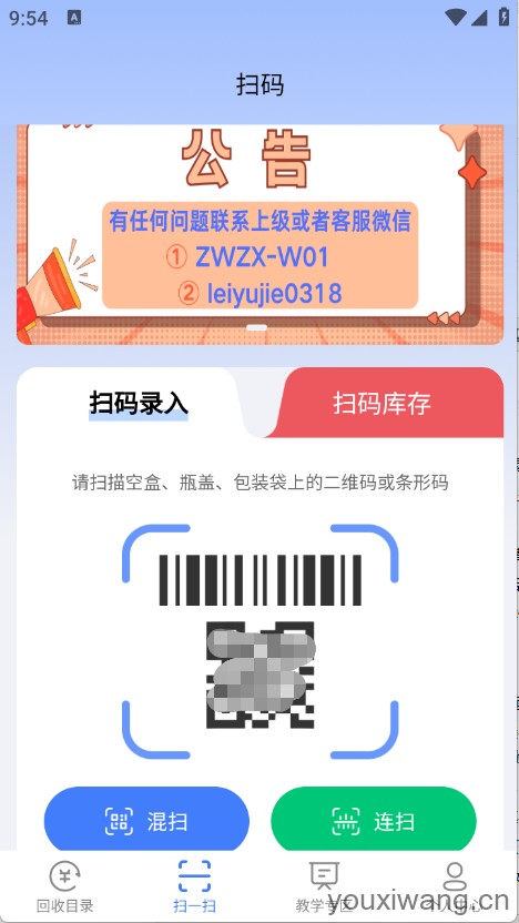 2、扫码回收:点击“扫码”功能,对准烟盒条码,识别完成后确认回收。