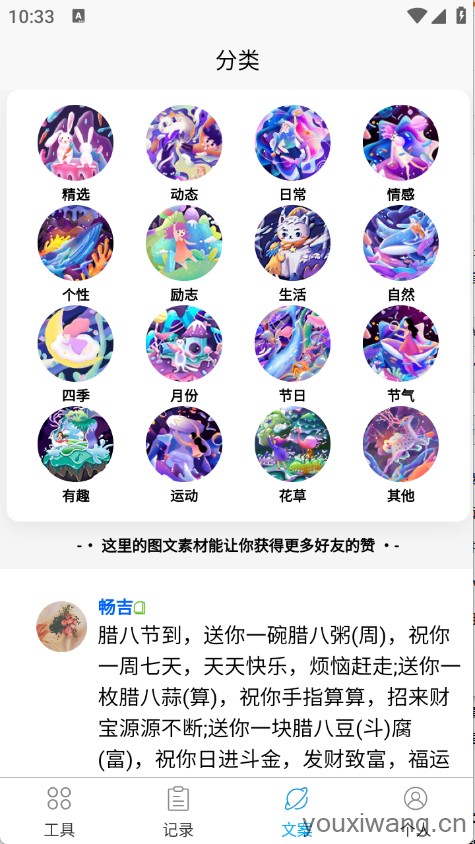 1、各种类型的文案资源可以满足广范围的场景,让朋友圈文案更精彩。