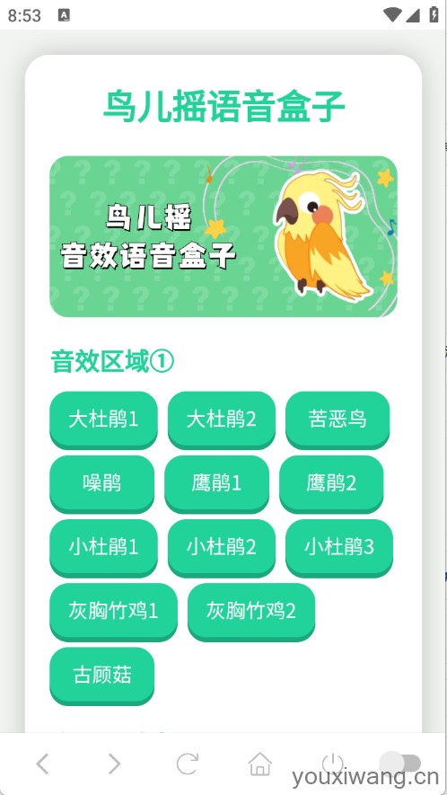鸟儿摇演奏器,拥有很多的你敖烈鸣声音频,所有的语音包都是吗免费的,另外还会根据用户的喜好智能精准推荐,支持单击播放、循环播放以及延迟播放,还可以适用于游戏或者日常聊天中。