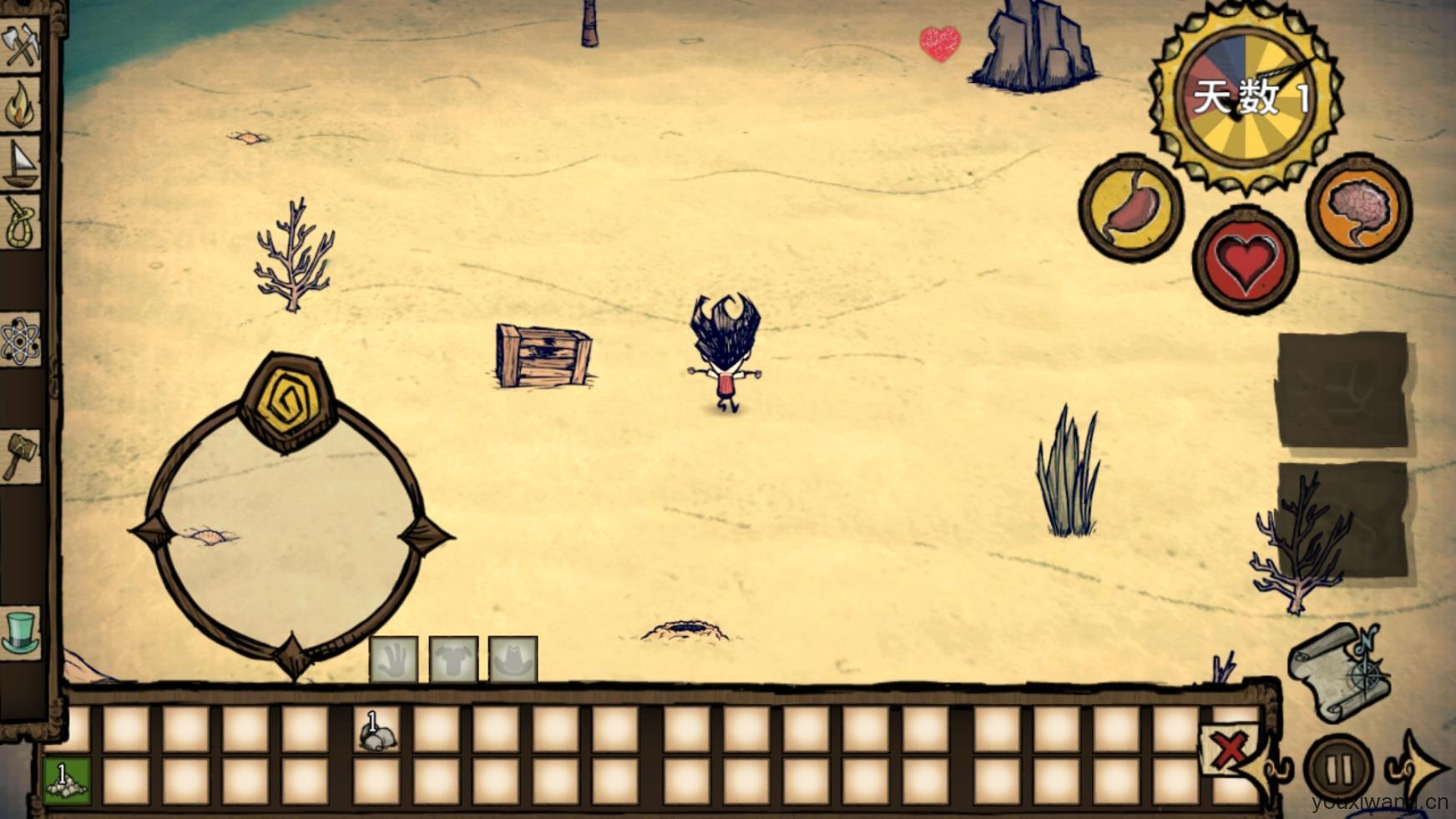 6、屏幕右上角分别是天数、玩家饥饿值、生命值、理智值。